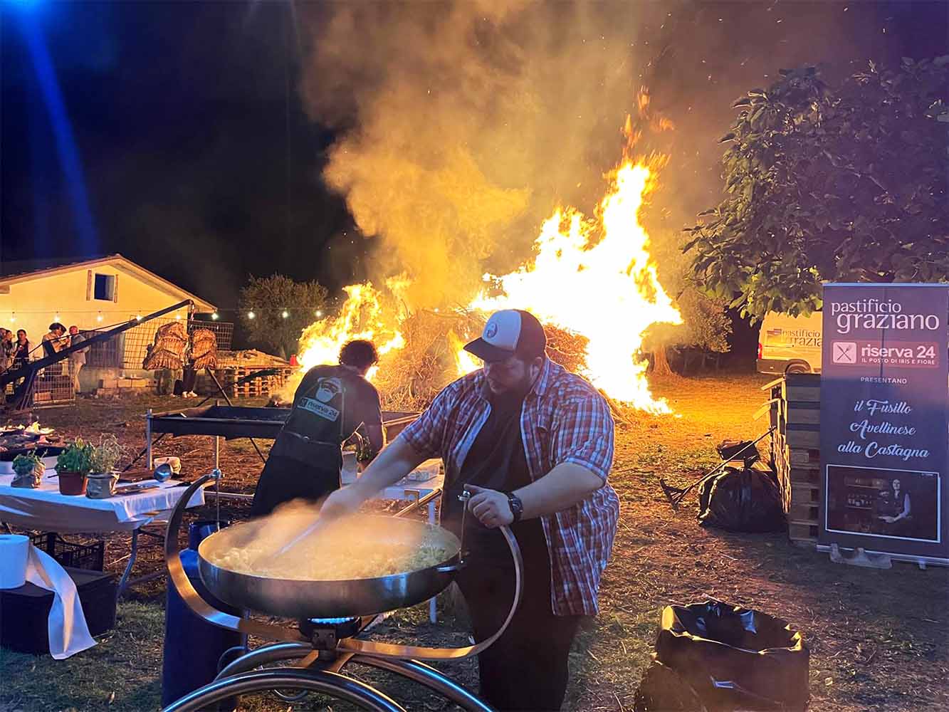 And there was more food. At midnight, as fresh rounds of pasta were produced along with fresh mozzarella, a group of bagpipers including a Franciscan monk piped in the glow of a house house-sized bonfire that had been set alight from mounds of straw and wood and farm refuse.