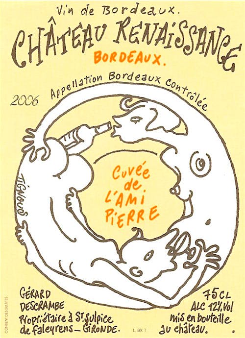 In 2008, Descrambe sold his St. Emilion vineyards, but he and his son, Olivier, still produce about 3,300 cases per year of Bordeaux appellation wine under his Chateau Renaissance label (also featuring cartoons). His wines are exported within Europe and to Japan but not to the United States. ("Too complicated," Descrambe sighs.)