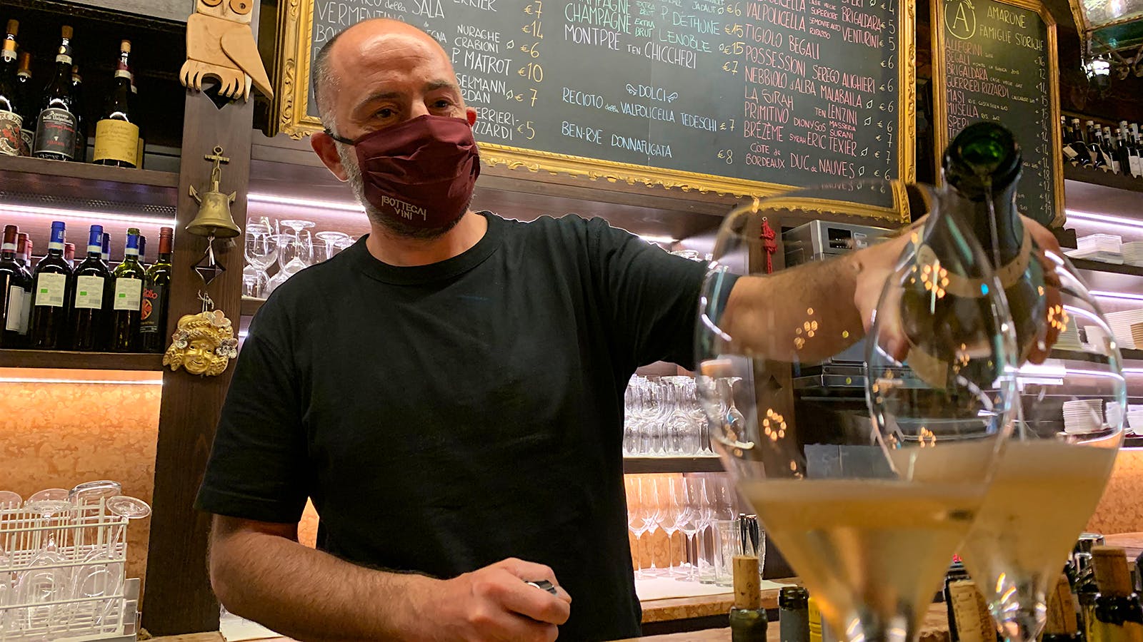 He pulls a mask bearing the Bottega logo up over his face, gets up from the table we’ve been sitting at and goes behind the bar to pour glasses of Champagne for a toast.