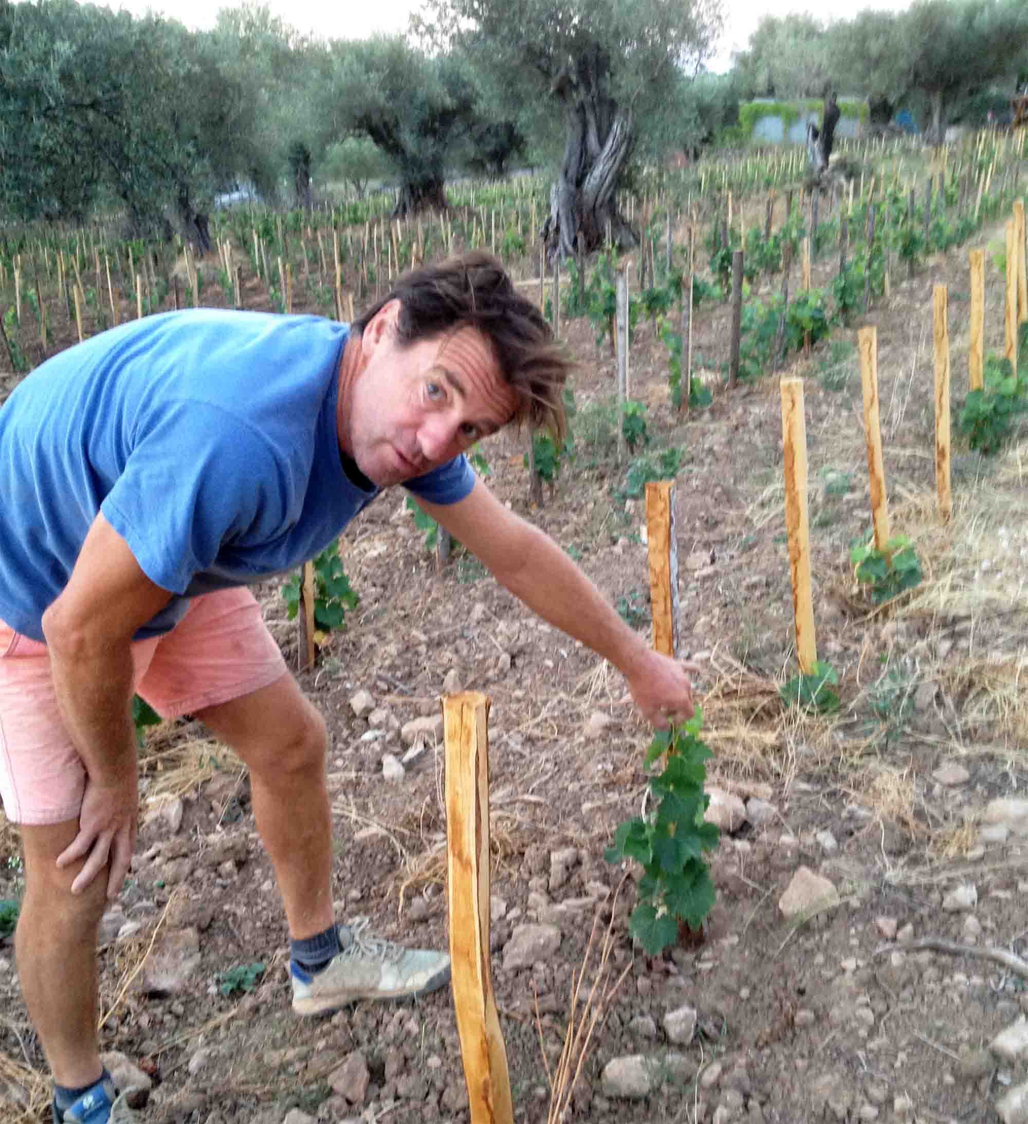 Espinasse drags a 400-yard-long hose from an agricultural water hookup to one corner of his well-plowed vineyard. His infant vines planted this spring vary in size from plot to plot. Healthier specimens are waist high and bushy. Others struggle, only a few inches tall and showing a few small green leaves.
