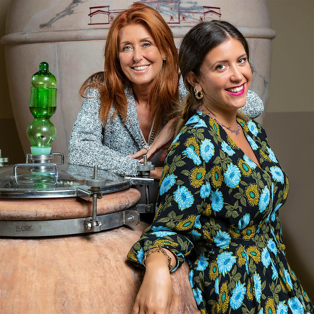 Mother, daughter and the traditional clay orcio in which they are fermenting the new Syrah