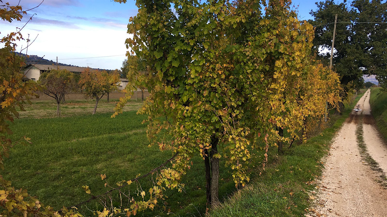 Trebbiano Spoletino is an Umbrian grape found in the flatlands below the hilltop-perched town of Spoleto. It was traditionally planted at the edge of family farms, grown in a system that defies modern vineyard-management techniques. The vines were planted maritata—literally "married" to maple or elm trees—with the canes climbing up to the high branches and using them for support. To give the vines even more room to grow, farmers strung wires between the trees.
