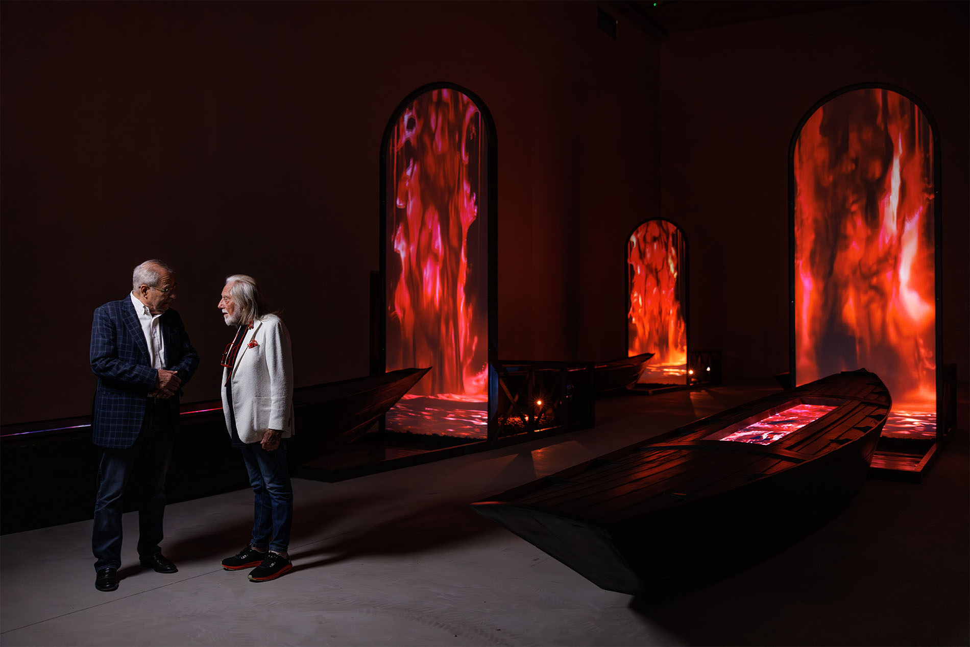 The “Soul of Amarone” is composed of four identical stations—each consisting of a black 26-foot-long Sandolo (the traditional Venetian flat-bottom cargo rowboat similar to a gondola) facing a tall, arched two-sided video screen. Both faces of the screens as well as longer screens set in the boats’ hulls play similar but not identical videos of cascading red wine must.