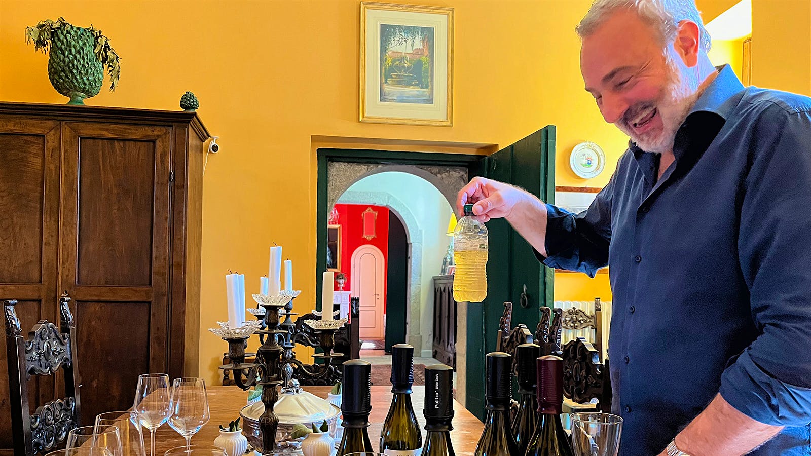 During a recent tasting of his aged Fiano wines at his estate, Roberto di Meo holds up a plastic bottle with a vat sample of a 1993 Fiano that has yet to be released.