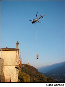 A helicopter carries the harvest from Nino Negri’s Inferno vineyards. "This is the most extreme terroir of Northern Italy," says Maule, who knows it well.