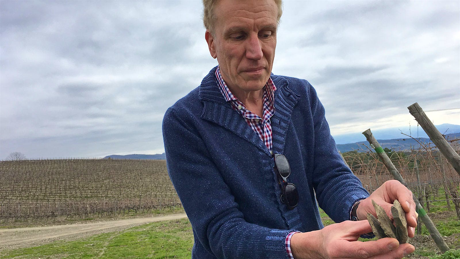 Holding up pieces of schistic rock from a vineyard south of Montalcino, Stefano Ruini notes how Burgundy's ancient Cistercian monks would taste soils to understand terroirs.